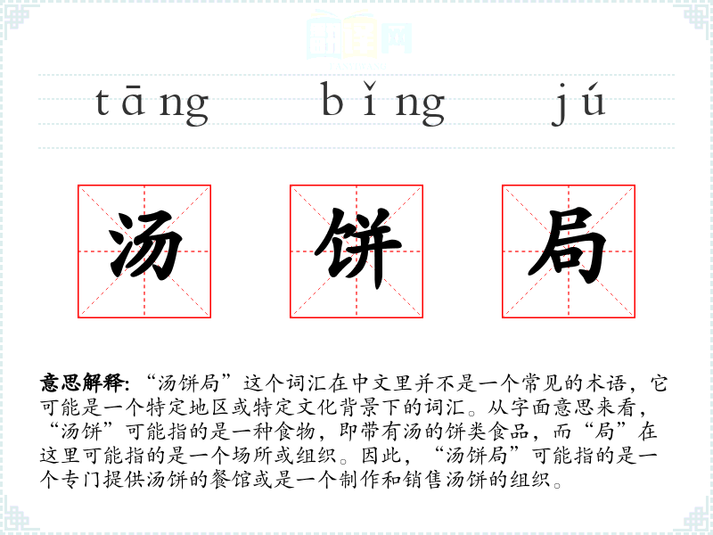 同义词可能包括“汤饼店”、“汤饼铺”等,这些词汇都指的是类似的场所或组织,但“汤饼局”可能带有更强的社区或组织色彩。反义词可能不太适用,因为这个词汇本身并不常见。