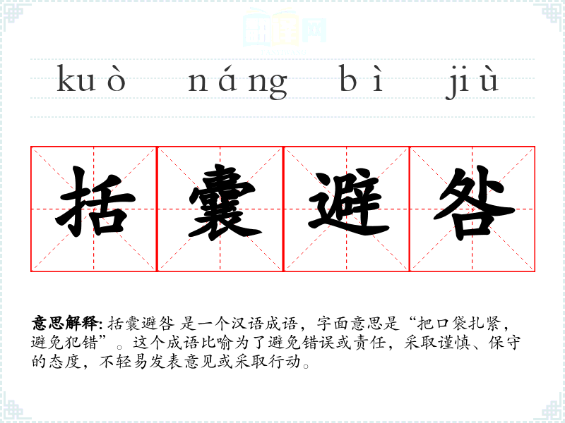 括囊避咎 是一个汉语成语,字面意思是“把口袋扎紧,避免犯错”。这个成语比喻为了避免错误或责任,采取谨慎、保守的态度,不轻易发表意见或采取行动。