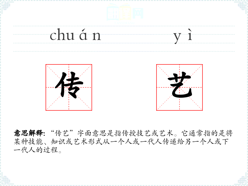 “传艺”字面意思是指传授技艺或艺术。它通常指的是将某种技能、知识或艺术形式从一个人或一代人传递给另一个人或下一代人的过程。