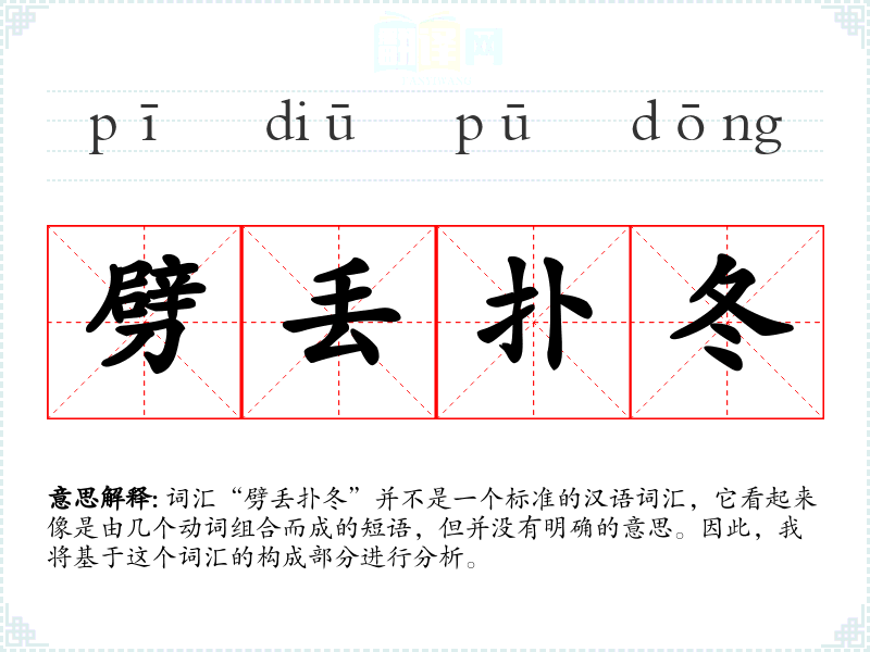 词汇“劈丢扑冬”并不是一个标准的汉语词汇,它看起来像是由几个动词组合而成的短语,但并没有明确的意思。因此,我将基于这个词汇的构成部分进行分析。