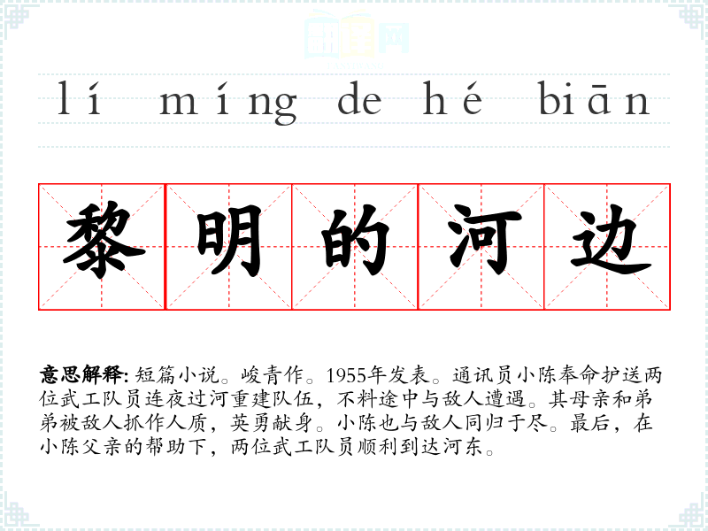 1.短篇小说。峻青作。1955年发表。通讯员小陈奉命护送两位武工队员连夜过河重建队伍,不料途中与敌人遭遇。其母亲和弟弟被敌人抓作人质,英勇献身。小陈也与敌人同归于尽。最后,在小陈父亲的帮助下,两位武工队员顺利到达河东。
