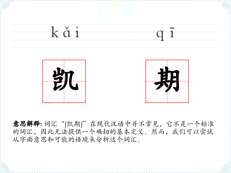 “凯期”由两个汉字组成:“凯”通常指胜利、成功,而“期”可以指一段时间或期望。结合起来,“凯期”可能指的是一个胜利或成功的时期,或者是对这样一个时期的期待。