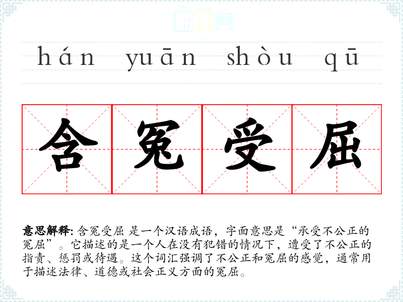 含冤受屈 是一个汉语成语,字面意思是“承受不公正的冤屈”。它描述的是一个人在没有犯错的情况下,遭受了不公正的指责、惩罚或待遇。这个词汇强调了不公正和冤屈的感觉,通常用于描述法律、道德或社会正义方面的冤屈。