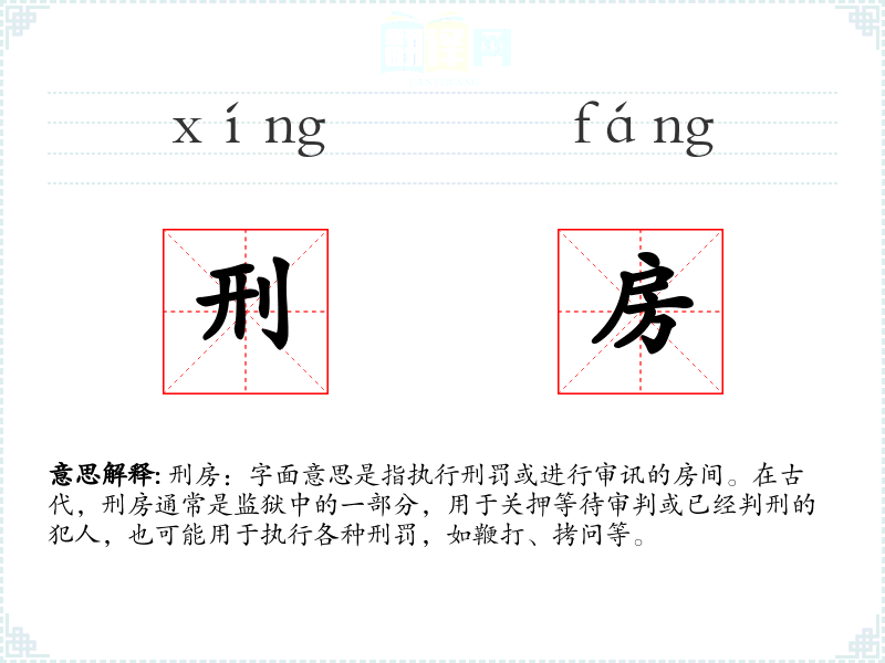刑房:字面意思是指执行刑罚或进行审讯的房间。在古代,刑房通常是监狱中的一部分,用于关押等待审判或已经判刑的犯人,也可能用于执行各种刑罚,如鞭打、拷问等。