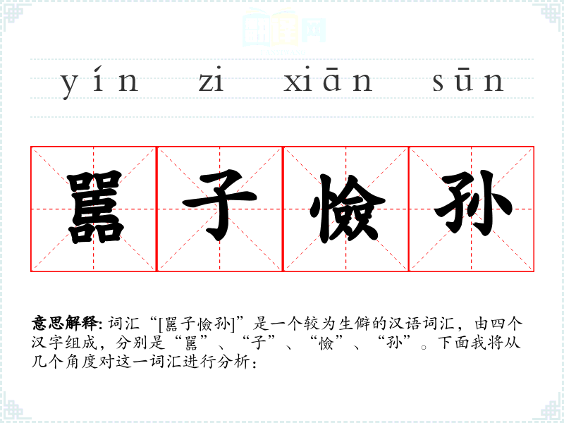 词汇“[嚚子憸孙]”是一个较为生僻的汉语词汇,由四个汉字组成,分别是“嚚”、“子”、“憸”、“孙”。下面我将从几个角度对这一词汇进行分析: