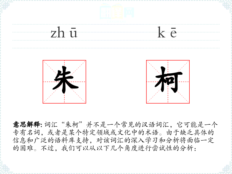 词汇“朱柯”并不是一个常见的汉语词汇,它可能是一个专有名词,或者是某个特定领域或文化中的术语。由于缺乏具体的信息和广泛的语料库支持,对该词汇的深入学习和分析将面临一定的困难。不过,我们可以从以下几个角度进行尝试性的分析:
