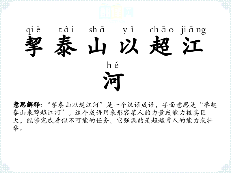 在英语中,类似的表达可能是“move mountains”,意为“克服巨大困难”,虽然意思相近,但“挈泰山以超江河”更强调力量和壮举的非凡性。