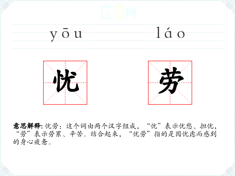 忧劳:这个词由两个汉字组成,“忧”表示忧愁、担忧,“劳”表示劳累、辛苦。结合起来,“忧劳”指的是因忧虑而感到的身心疲惫。