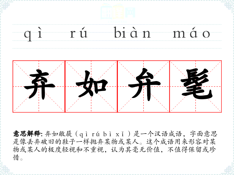 弃如敝屣(qì rú bì xǐ)是一个汉语成语,字面意思是像丢弃破旧的鞋子一样抛弃某物或某人。这个成语用来形容对某物或某人的极度轻视和不重视,认为其毫无价值,不值得保留或珍惜。