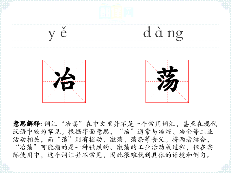 由于“冶荡”不是一个常用词汇,相关的同义词和反义词也难以确定。在词源与演变方面,这个词汇可能源自古代汉语,但在现代汉语中已经很少使用,因此其历史演变和在语言中的变化也难以追溯。