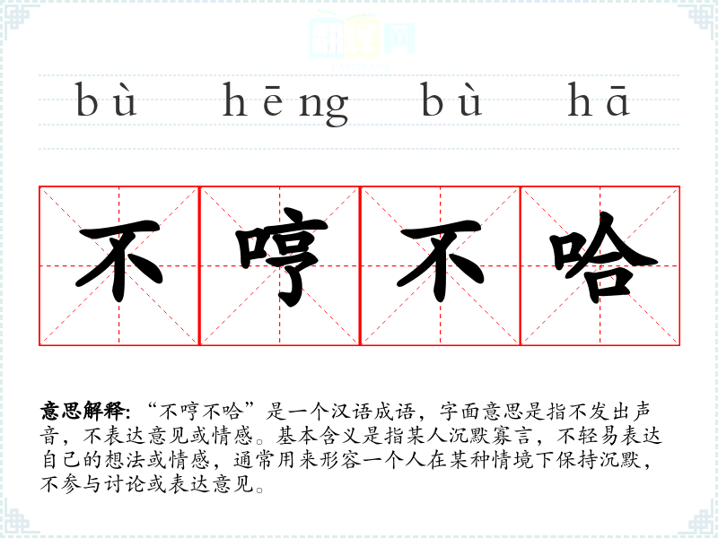 “不哼不哈”是一个汉语成语,字面意思是指不发出声音,不表达意见或情感。基本含义是指某人沉默寡言,不轻易表达自己的想法或情感,通常用来形容一个人在某种情境下保持沉默,不参与讨论或表达意见。
