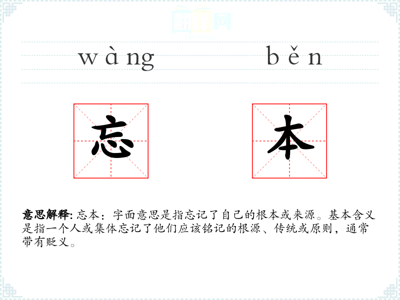 忘本:字面意思是指忘记了自己的根本或来源。基本含义是指一个人或集体忘记了他们应该铭记的根源、传统或原则,通常带有贬义。