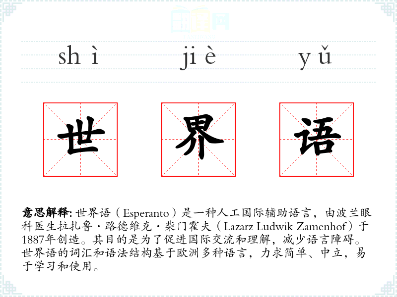 - 同义词:国际语(Interlingua),也是一种人工国际辅助语言,但与世界语在词汇来源和语法结构上有所不同。