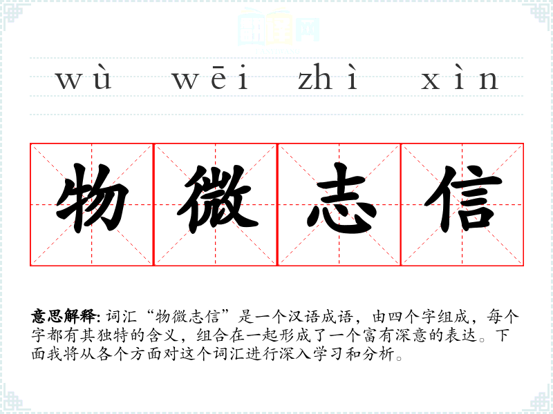 词汇“物微志信”是一个汉语成语,由四个字组成,每个字都有其独特的含义,组合在一起形成了一个富有深意的表达。下面我将从各个方面对这个词汇进行深入学*和分析。