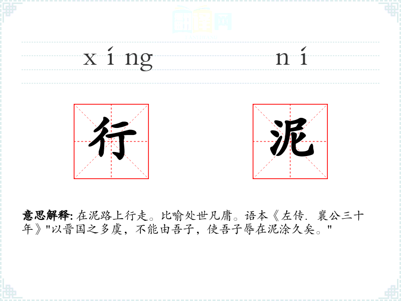 在泥路上行走。比喻处世凡庸。语本《左传.襄公三十年》"以晋国之多虞,不能由吾子,使吾子辱在泥涂久矣。"