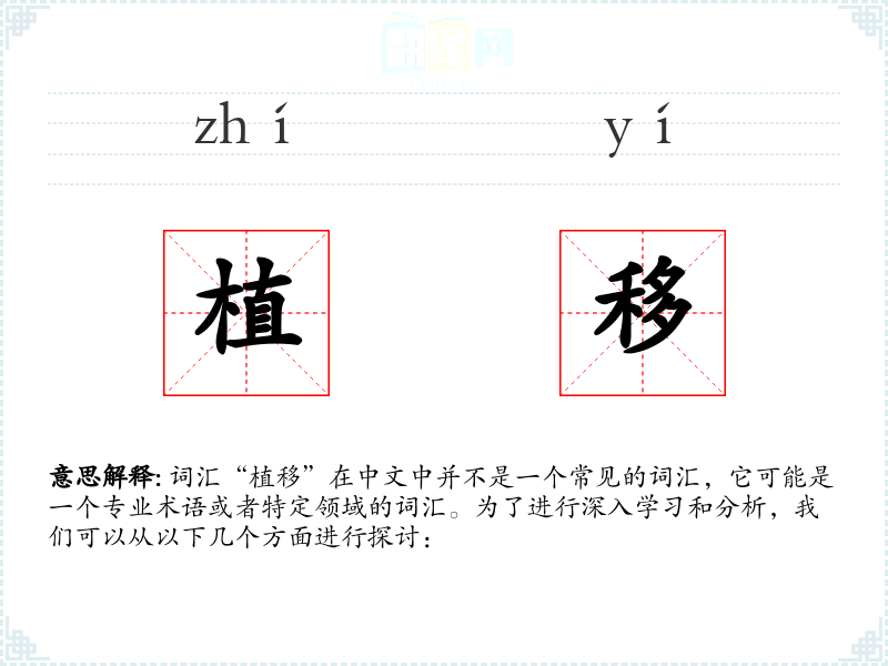 词汇“植移”在中文中并不是一个常见的词汇,它可能是一个专业术语或者特定领域的词汇。为了进行深入学*和分析,我们可以从以下几个方面进行探讨: