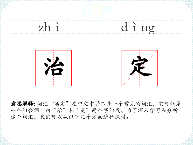 词汇“治定”在中文中并不是一个常见的词汇,它可能是一个组合词,由“治”和“定”两个字组成。为了深入学习和分析这个词汇,我们可以从以下几个方面进行探讨: