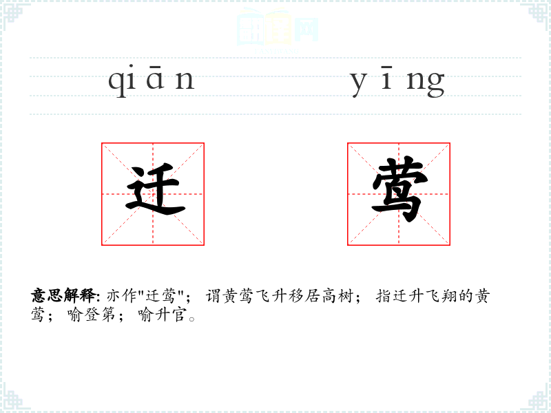 亦作"迁莺"; 谓黄莺飞升移居高树; 指迁升飞翔的黄莺; 喻登第; 喻升官。