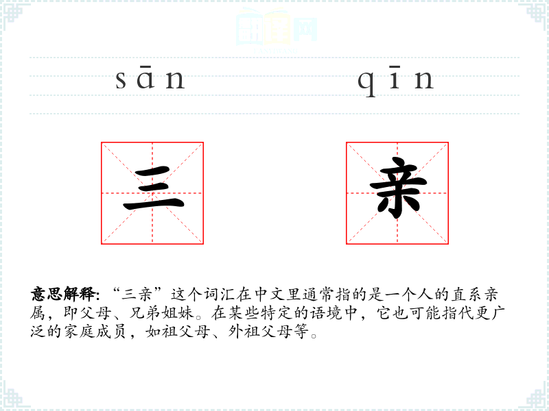 - 文学:在文学作品中,“三亲”常用来强调家庭关系的重要性,如在描述人物背景或情感纠葛时。
