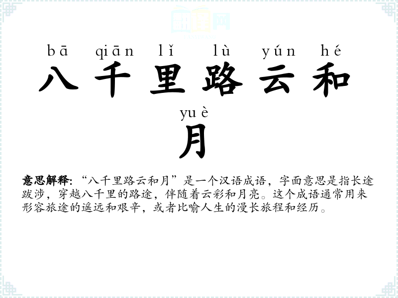 “八千里路云和月”这个成语的词源并不十分明确,但它显然是受到了**古代文学和历史的影响。在古代,人们常用“八千里”来形容非常遥远的距离,而“云和月”则是旅途中的常见景象,用来象征旅途的艰辛和孤独。
