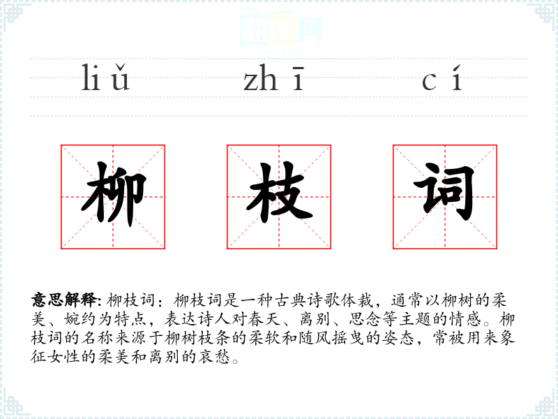 柳枝词的词源可以追溯到**古代的诗歌传统,特别是唐宋时期的诗词。柳树因其柔美的枝条和随风摇曳的姿态,常被诗人用来象征柔情和离别,逐渐形成了特定的诗歌体裁。