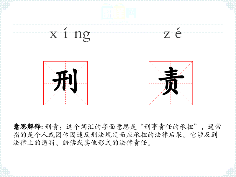 刑责:这个词汇的字面意思是“刑事责任的承担”,通常指的是个人或团体因违反刑法规定而应承担的法律后果。它涉及到法律上的惩罚、赔偿或其他形式的法律责任。