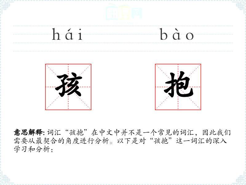 “孩抱”字面意思是指抱着孩子。其中,“孩”指的是儿童或小孩,“抱”则是指用手臂环绕以支撑或保护的动作。