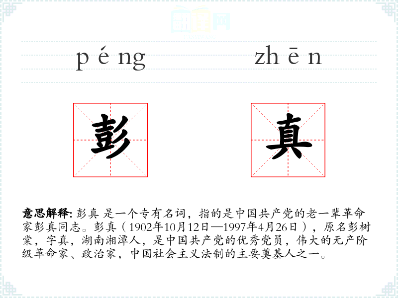 彭真 是一个专有名词,指的是*共产党的老一辈革命家彭真同志。彭真(1902年10月12日—1997年4月2日),原名彭树棠,字真,湖南湘潭人,是共产党的优秀党员,伟大的无产阶级革命家、政治家,社会主义法制的主要奠基人之一。