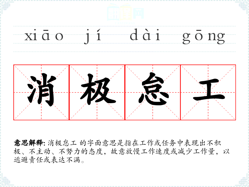 消极怠工 的字面意思是指在工作或任务中表现出不积极、不主动、不努力的态度,故意放慢工作速度或减少工作量,以逃避责任或表达不满。