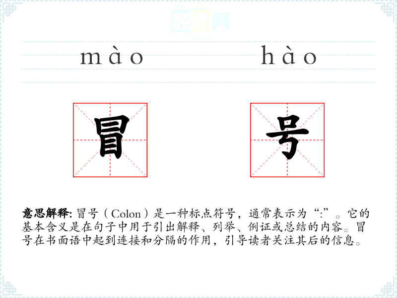 冒号(Colon)是一种标点符号,通常表示为“:”。它的基本含义是在句子中用于引出解释、列举、例证或总结的内容。冒号在书面语中起到连接和分隔的作用,引导读者关注其后的信息。