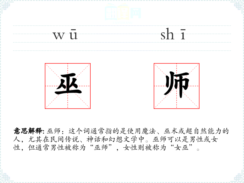 巫师:这个词通常指的是使用魔法、巫术或超自然能力的人,尤其在民间传说、神话和幻想文学中。巫师可以是男性或女性,但通常男性被称为“巫师”,女性则被称为“女巫”。