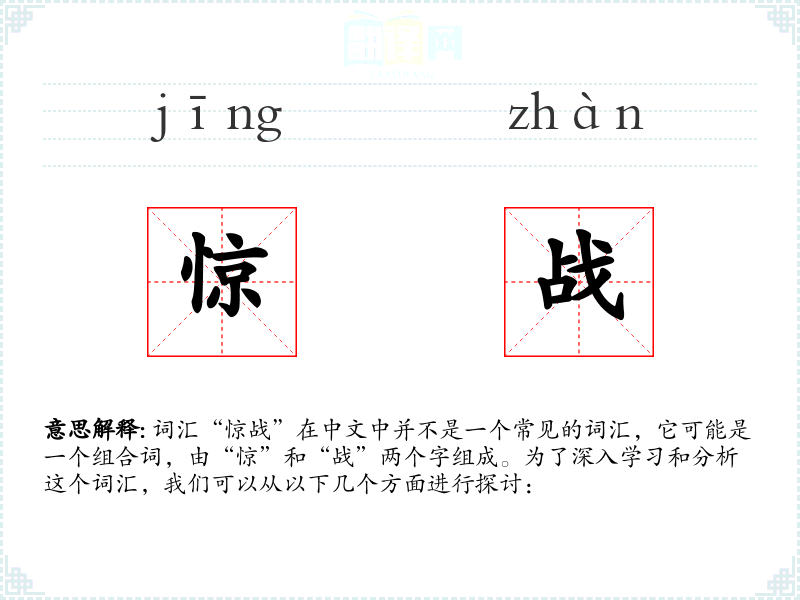 词汇“惊战”在中文中并不是一个常见的词汇,它可能是一个组合词,由“惊”和“战”两个字组成。为了深入学习和分析这个词汇,我们可以从以下几个方面进行探讨: