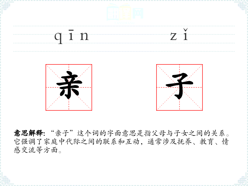 “亲子”这个词的字面意思是指父母与子女之间的关系。它强调了家庭中代际之间的联系和互动,通常涉及抚养、教育、情感交流等方面。