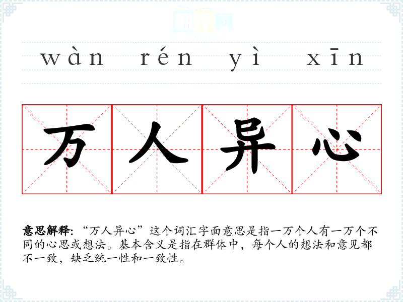 “万人异心”这个词汇字面意思是指一万个人有一万个不同的心思或想法。基本含义是指在群体中,每个人的想法和意见都不一致,缺乏统一性和一致性。