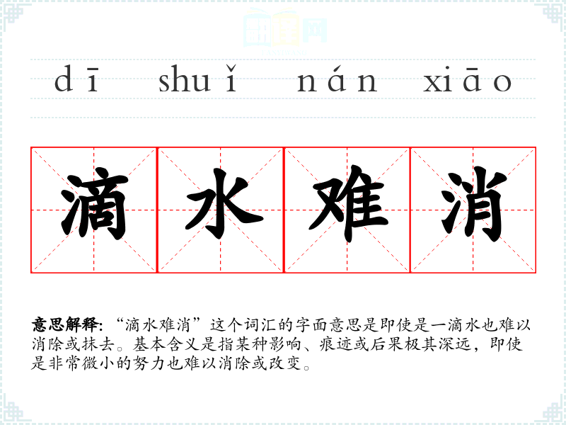 “滴水难消”这个词汇的字面意思是即使是一滴水也难以消除或抹去。基本含义是指某种影响、痕迹或后果极其深远,即使是非常微小的努力也难以消除或改变。