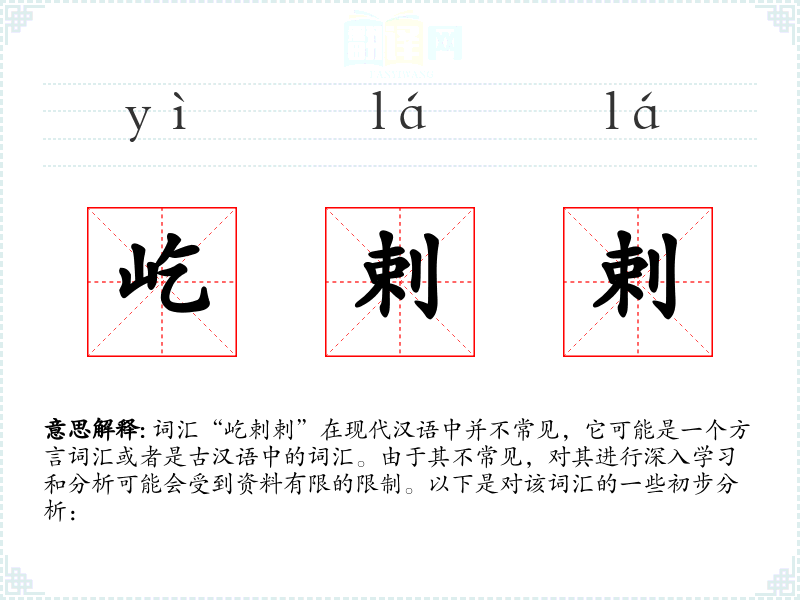 词汇“屹剌剌”在现代汉语中并不常见,它可能是一个方言词汇或者是古汉语中的词汇。由于其不常见,对其进行深入学习和分析可能会受到资料有限的限制。以下是对该词汇的一些初步分析: