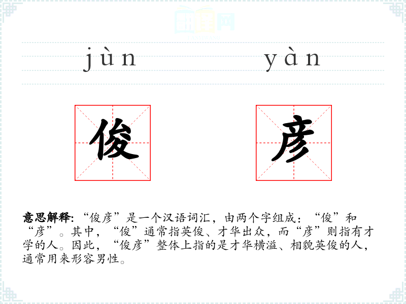 “俊彦”是一个汉语词汇,由两个字组成:“俊”和“彦”。其中,“俊”通常指英俊、才华出众,而“彦”则指有才学的人。因此,“俊彦”整体上指的是才华横溢、相貌英俊的人,通常用来形容男性。