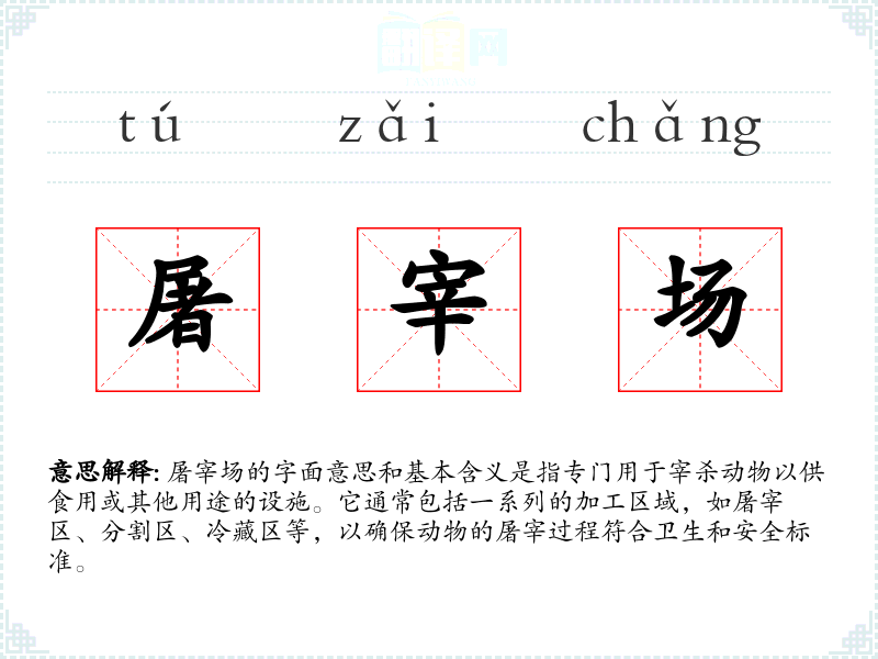 同义词:宰杀场、屠场、肉联厂 反义词:养殖场、牧场、动物保护区