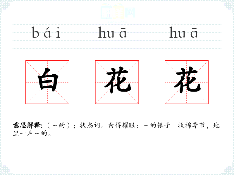 (~的);状态词。白得耀眼:~的银子|收棉季节,地里一片~的。