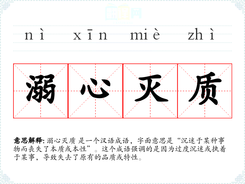 溺心灭质 是一个汉语成语,字面意思是“沉迷于某种事物而丧失了本质或本性”。这个成语强调的是因为过度沉迷或执着于某事,导致失去了原有的品质或特性。