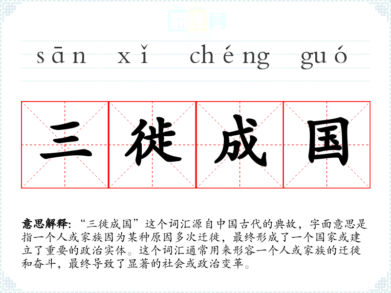 “三徙成国”这个词汇源自**古代的典故,字面意思是指一个人或家族因为某种原因多次迁徙,最终形成了一个国家或建立了重要的政治实体。这个词汇通常用来形容一个人或家族的迁徙和奋斗,最终导致了显著的社会或政治变革。