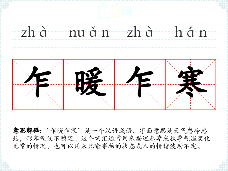 “乍暖乍寒”是一个汉语成语,字面意思是天气忽冷忽热,形容气候不稳定。这个词汇通常用来描述春季或秋季气温变化无常的情况,也可以用来比喻事物的状态或人的情绪波动不定。