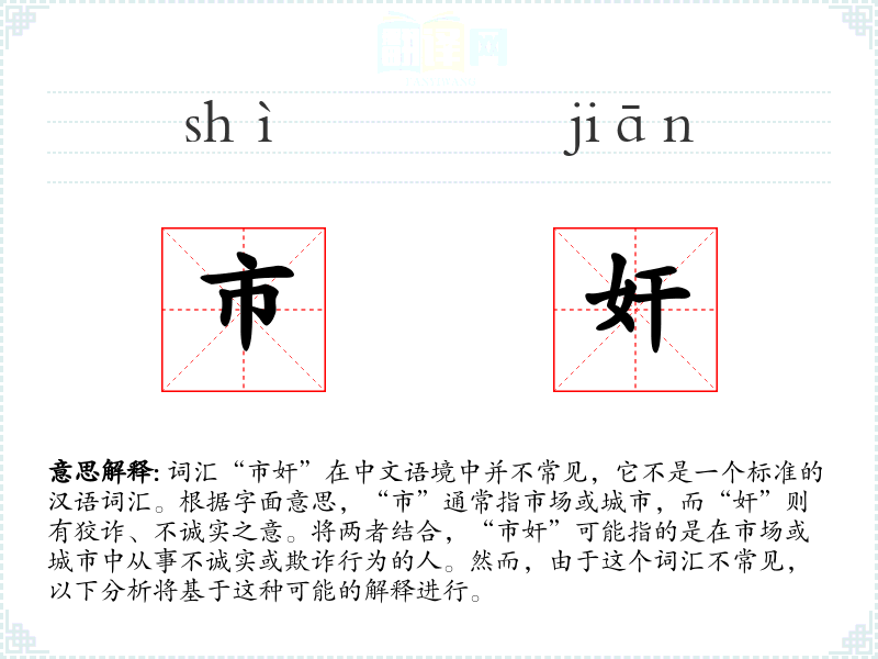 词汇“市奸”在中文语境中并不常见,它不是一个标准的汉语词汇。根据字面意思,“市”通常指市场或城市,而“奸”则有狡诈、不诚实之意。将两者结合,“市奸”可能指的是在市场或城市中从事不诚实或欺诈行为的人。然而,由于这个词汇不常见,以下分析将基于这种可能的解释进行。