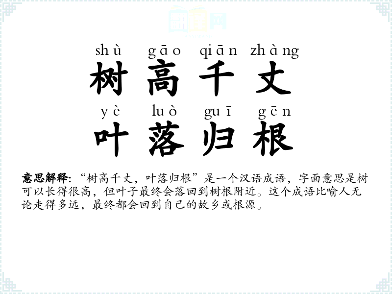 “树高千丈,叶落归根”是一个汉语成语,字面意思是树可以长得很高,但叶子最终会落回到树根附近。这个成语比喻人无论走得多远,最终都会回到自己的故乡或根源。