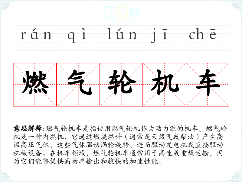 同义词:涡轮机车、燃气动力机车 反义词:蒸汽机车、电力机车