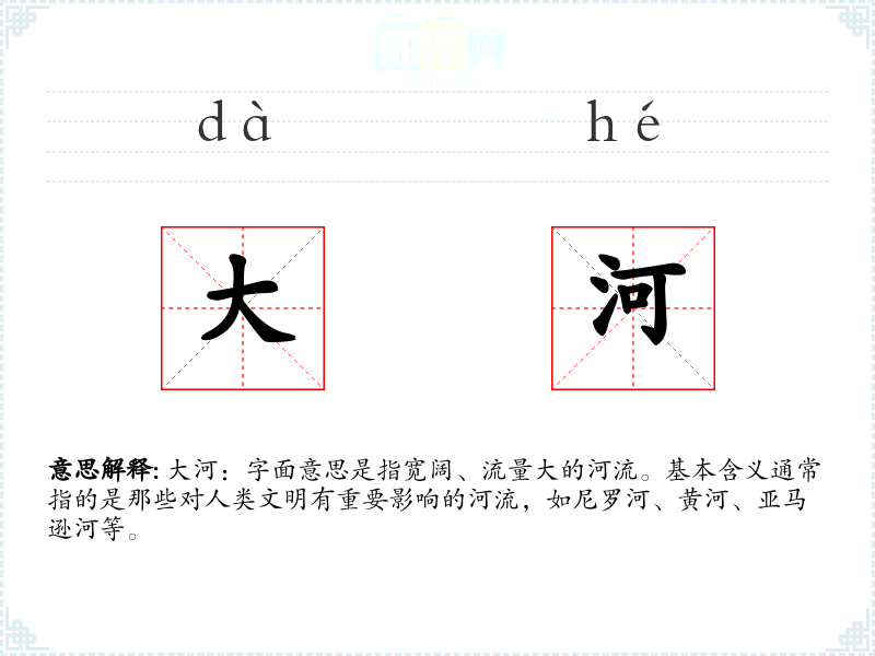 大河:字面意思是指宽阔、流量大的河流。基本含义通常指的是那些对人类文明有重要影响的河流,如尼罗河、黄河、亚马逊河等。