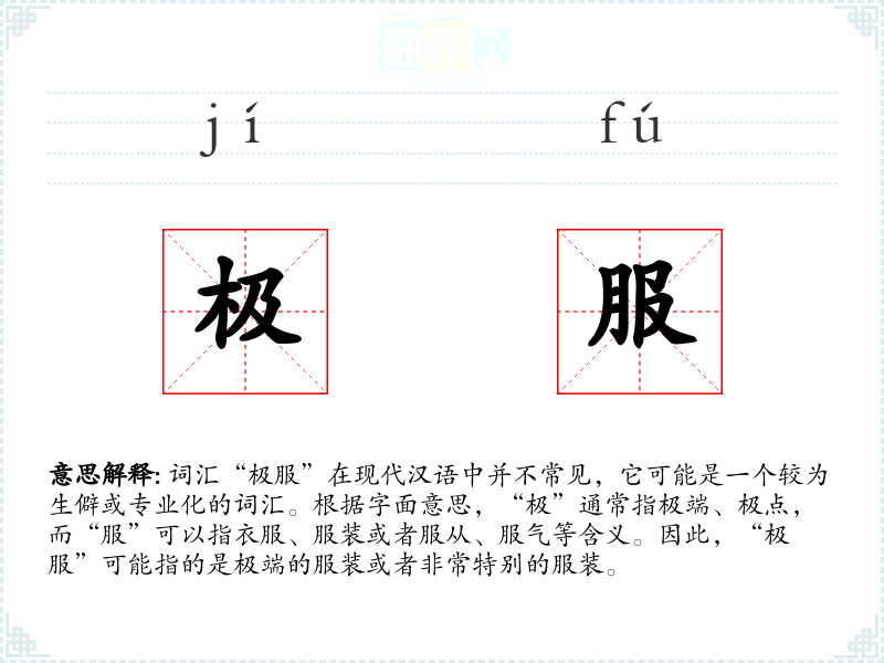 词汇“极服”在现代汉语中并不常见,它可能是一个较为生僻或专业化的词汇。根据字面意思,“极”通常指极端、极点,而“服”可以指衣服、服装或者服从、服气等含义。因此,“极服”可能指的是极端的服装或者非常特别的服装。