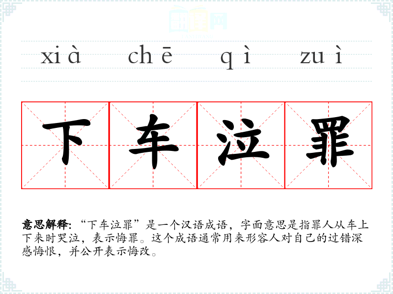 “下车泣罪”是一个汉语成语,字面意思是指罪人从车上下来时哭泣,表示悔罪。这个成语通常用来形容人对自己的过错深感悔恨,并公开表示悔改。
