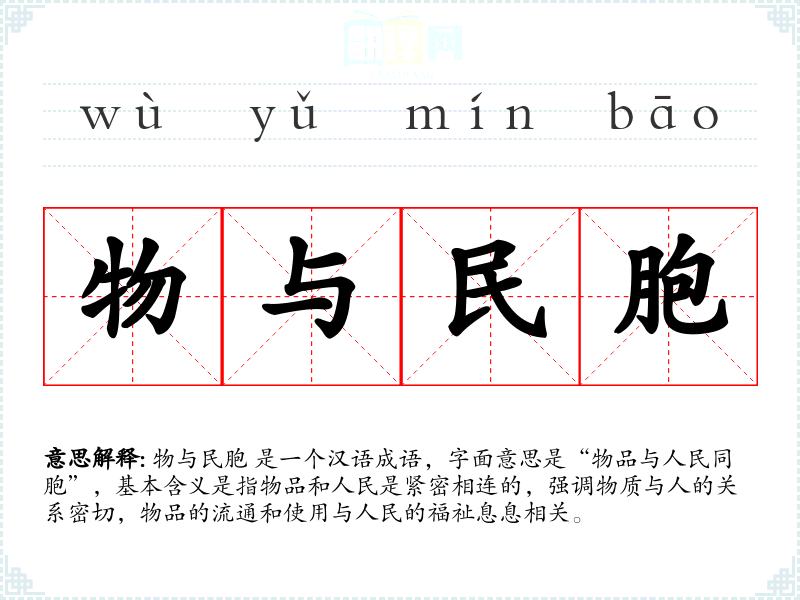 物与民胞 是一个汉语成语,字面意思是“物品与人民同胞”,基本含义是指物品和人民是紧密相连的,强调物质与人的关系密切,物品的流通和使用与人民的福祉息息相关。