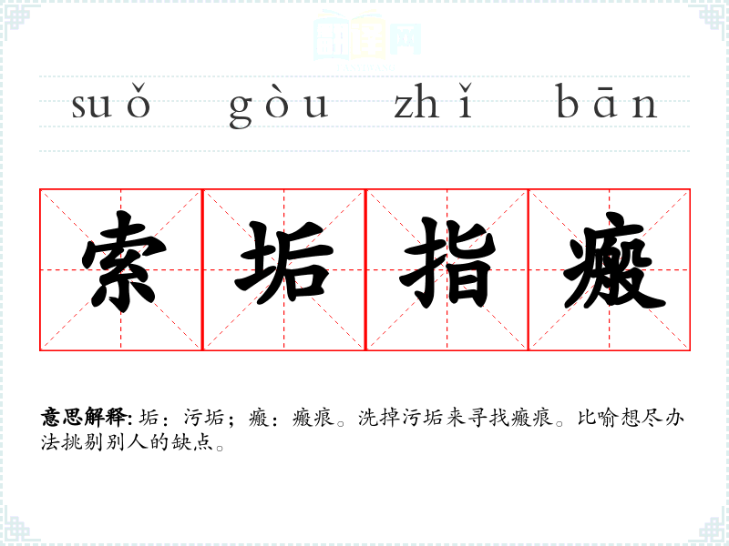 垢:污垢;瘢:瘢痕。洗掉污垢来寻找瘢痕。比喻想尽办法挑剔别人的缺点。